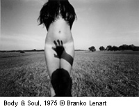 Nennt Branko Lenart die aus Fotografien seit 1971 zusammengestellte Werkserie deshalb Body.Language, um sich gegenüber dem weiten Feld der Aktfotografie abzugrenzen oder öffnet er den Blick auf eine andere Sicht und eine weiterführende Erfahrung der Nacktheit? Auf vielfältige Art und Weise liegen Antworten auf diese Frage vor uns. Speziell die Körperfragmente, die vor Landschafts- und Naturtexturen platziert sind, erweitern das geläufige Vokabular. Hände und Arme, Füße und Beine sind zu skulpturalen Formen „verkürzt“ und kontrastieren mit dem Oberflächenrelief des Felsens. Oder: Vor dem weiten Horizont des Wassers bauen sich aus Gliedmaßen statuarische Elemente auf, die sich, vielleicht überraschend, in deutlicher Weise mehr Raum verschaffen als das der kompletten Gestalt gelingen würde. Ein ebenso charakteristisches wie unverwechselbares Moment dieser Bildthematik liegt in der besonderen Art der Kommunikation mit dem nackten Körper. Es ist der Fotograf selbst, der mit dem Körper als Gegenüber durch die ausgestreckten Hände interagiert und den Moment der Aktion in eine strenge dauerhafte Komposition kippt. Schattenmarkierungen auf dem „verhüllten“ weiblichen Akt lassen diesen in der weiten Landschaft wie eine fremdartige Stele erscheinen. Der zu Stein gewordene nackte Mensch wird in Ausschnitten fotografisch reproduziert wie er auch einem in derselben Haltung und im selben Format am felsigen Strand liegenden gegenübergestellt ist.